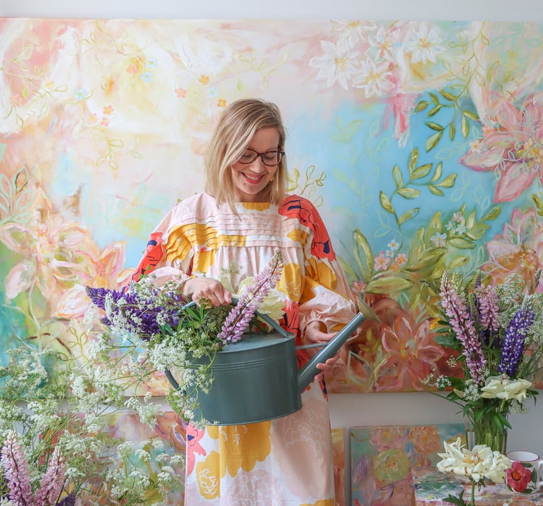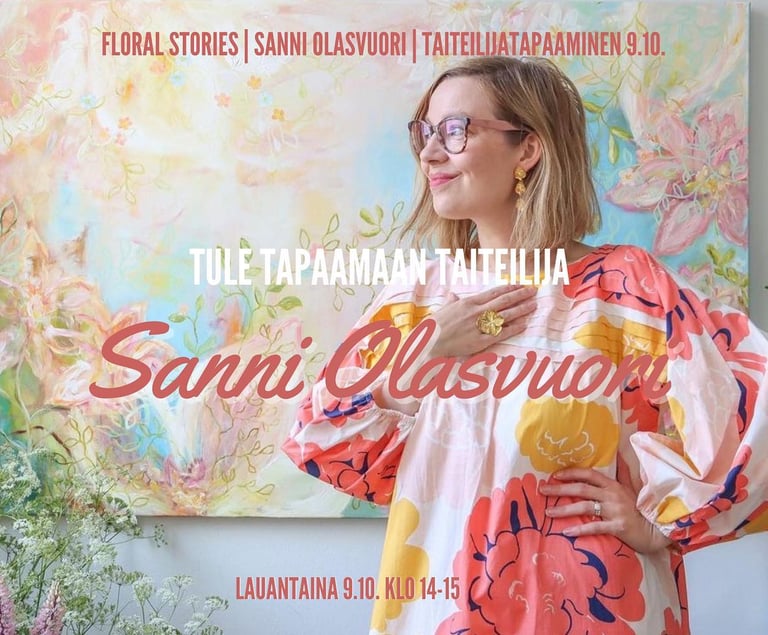 Enää kaksi viikkoa jäljellä Sanni Olasvuoren Floral Stories -näyttelyä! Tule tapaamaan tämä ihana taidemaalari Joogaholiaan lauantaina 9.10.