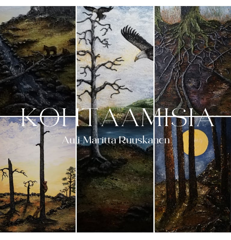 Auli-Maritta Ruuskanen on freelancer-taiteilija ja kuvataideterapeutti Kokkolasta. Kohtaamisia-näyttelyllään hän haluaa kutsua sinut kohtaamisiin meitä ympäröivän ja meidän sisällämme elävän luonnon kanssa. Näyttelyä täydentävät luonnon äänet ja metsän tuoksu. Olet tervetullut luontoretkelle Joogaholiaan.